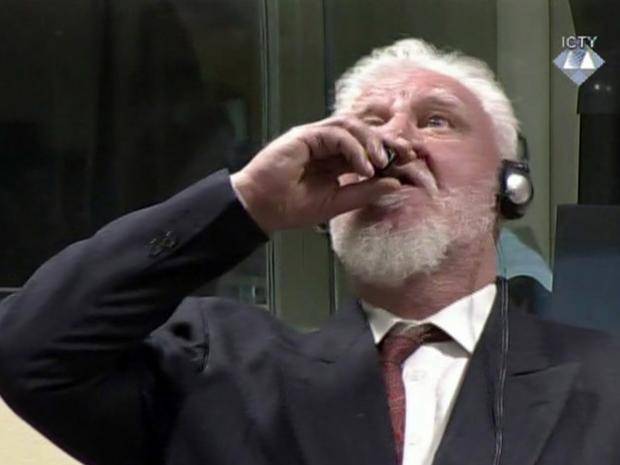 A former Bosnian Croat military commander swallowed what he said was poison in a U.N. war crimes courtroom on Wednesday and died shortly after losing an appeal against his 20-year prison term.