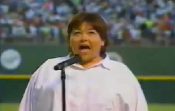 If you are looking for evidence that Jews harbor a deep hatred and contempt for their host countries, the above video should suffice. It is of the gross, obese, Jew pigess Roseanne Barr singing the National Anthem at a San Diego Padres baseball game on July 25, 1990.