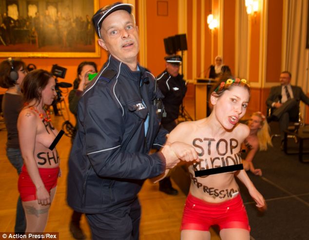 The Berlin Islam Week event, held in one of the city’s town halls, was stopped in its tracks by members of extreme protest group Femen, who charged into the hall with slogans attacking ‘religious oppression’ and Sharia law daubed on their bodies.
