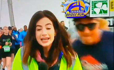 Georgia man Tommy Callaway was seen on video running up behind reporter Alex Bozarjian of WSAV and taking the swipe during the Enmarket Savannah Bridge Run.