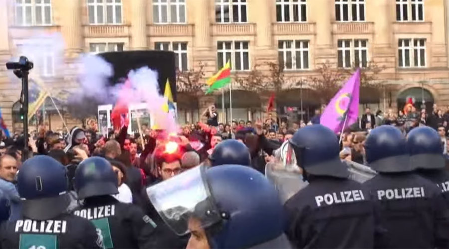 German riot police used pepper spray and batons to subdue violent clashes that broke out as pro-Kurdish activists confronted participants in rallies supporting the Turkish government as they marched through several major cities on Saturday.
