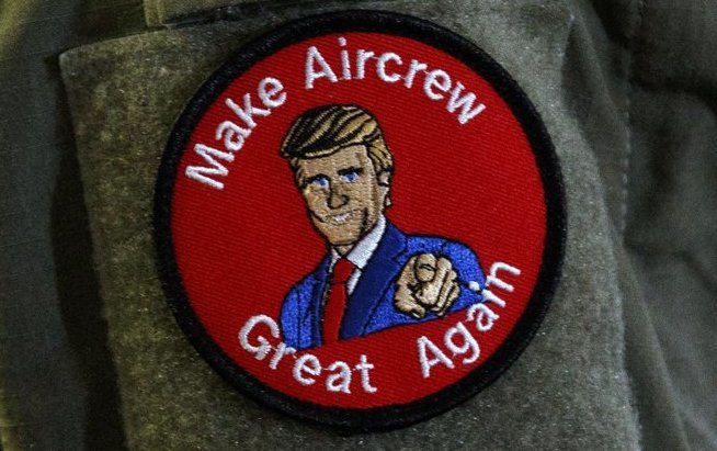 The phrase emblazoned on the patch, along with a likeness of Trump, is a play on his campaign slogan.
