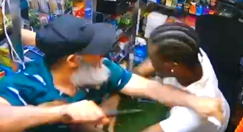 “Papa, I don’t want a problem, papa,” Jose Alba, 61, calmly tells an angry Austin Simon as the man walks behind the Hamilton Heights deli counter, the footage reveals.