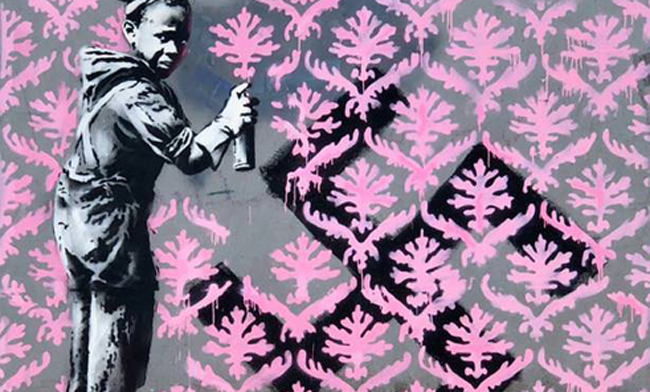 The first work was found on June 20 – World Refugee Day – and depicts a child spray painting pink flock wallpaper over a black swastika.