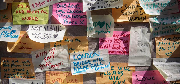 The notes, bearing messages such as ‘London Bridge will never fall down’ and ‘Not afraid, love you London’, lined a wall at the south end of London Bridge.