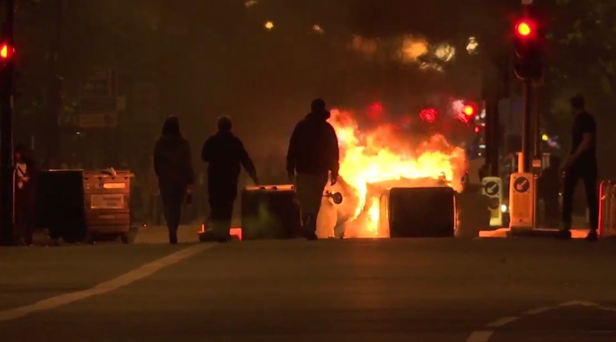 Protesters blocked the road in east London’s Dalston district, attacking riot police with fireworks and Molotov cocktails, and setting makeshift barricades on fire in protest over the death of Rashan Charles following a police chase.