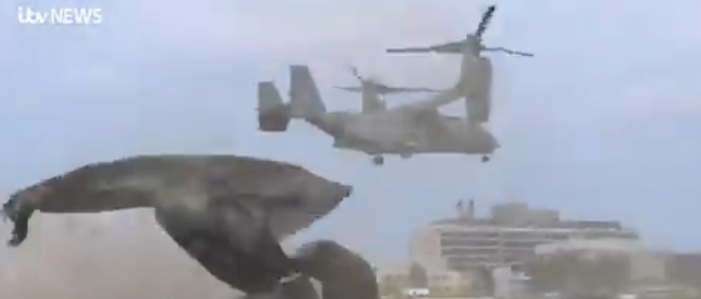 An American CV22 Osprey tiltrotor military craft was captured on film as it attempted to take off from Addenbrooke’s Hospital in Cambridge on Wednesday, with the downward blast of air from its propellers destroying the pad and sending parts flying across the hospital grounds.