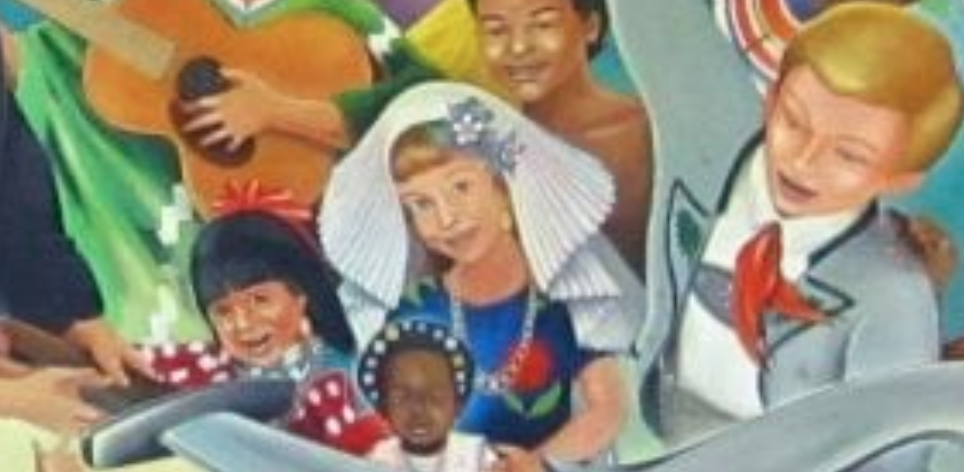 The second part of the mural, the “after,” shows the children of all races in the traditional garb of their respective nations gathered around a plant, living in harmony with nature.